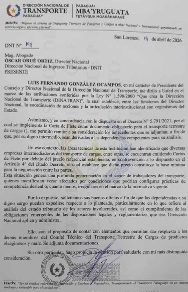La Dirección Nacional de Transporte (DINATRAN), bajo la gestión del Lic. Luis Fernando González, ha remitido a la Dirección Nacional de Ingresos Tributarios (DNIT) antecedentes de empresas que operan con valores irregulares en sus servicios de carga. La medida surge tras detectar inconsistencias en las Cartas de Flete registradas durante el primer cuatrimestre de 2026.