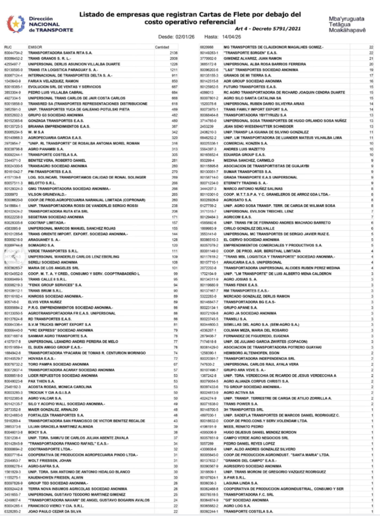 • Incumplimiento normativo: Se detectaron fletes con valores inferiores al costo operativo referencial, lo cual contraviene el Art. 4° del Decreto N° 5791/2021.