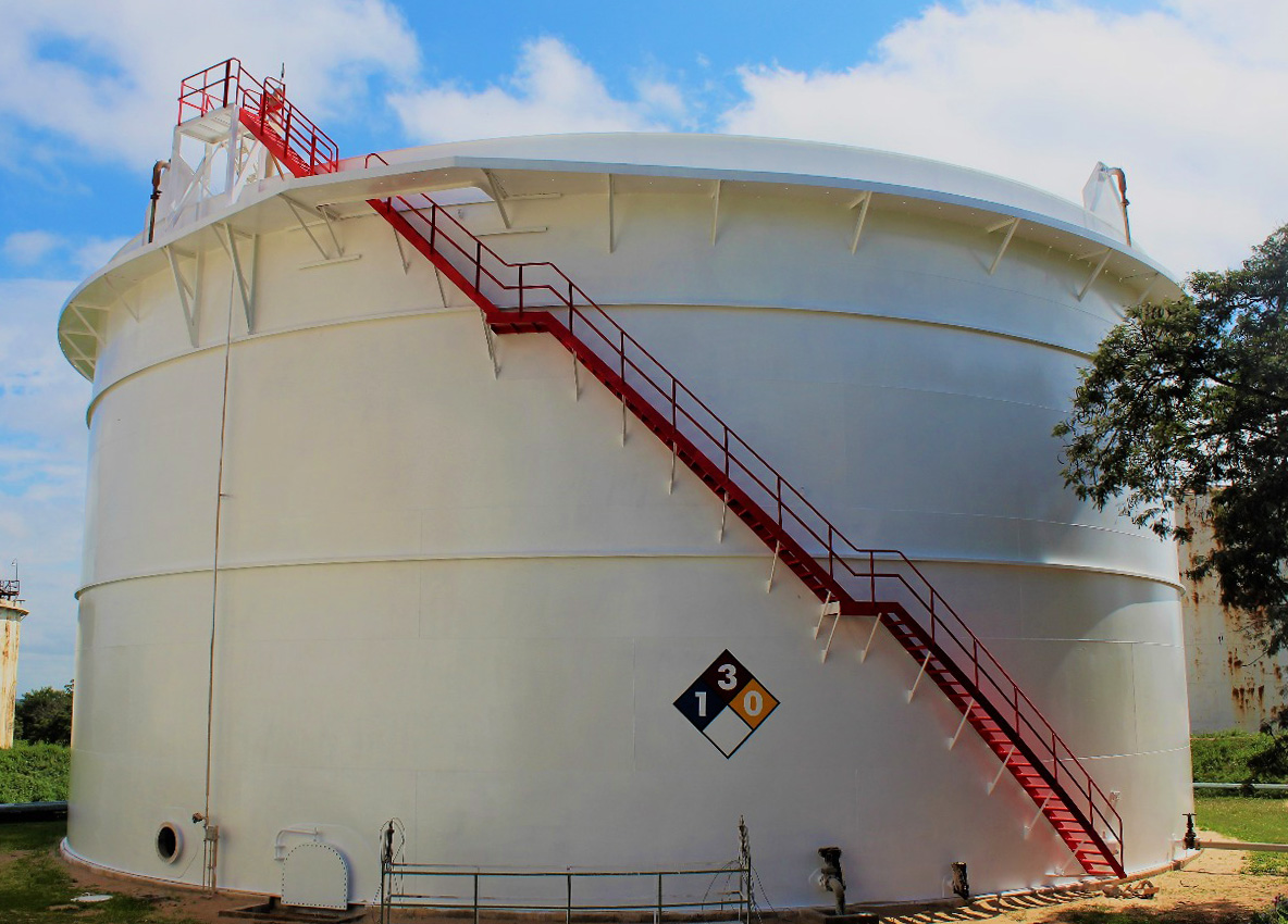 Los primeros tanques pintados son destinados, uno, para el almacenamiento de nafta con dimensión de 2.123 m² de superficie, incluyendo pared lateral y techo flotante. Mientras que el otro, es destinado para el almacenamiento de gasoil con una superficie de 2.844 m² incluyendo la pared lateral y el techo fijo.